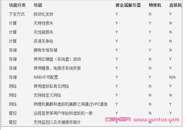 裸金属服务器与物理机、虚拟机(云服务器)的功能对比: