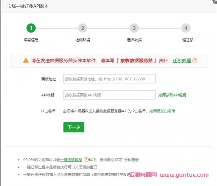 注意事项:经过数据分析有部分用户未在API配置中添加IP白名单,导致无法迁移并提示目标面板无法连接。