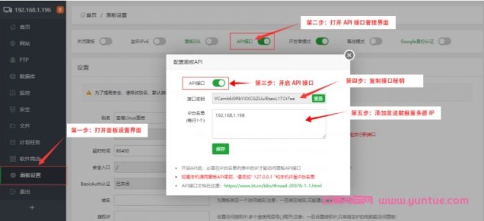 4,安装完成后点设置,填写迁入服务器宝塔面板信息和API秘钥(第3步生成的)