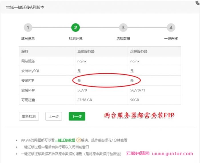 5,检测新旧服务器环境,注意两台服务器都必须安装FTP,没有安装FTP是不行的,安装FTP的方式跟安装一键迁移的方式一样,直接搜FTP安装即可