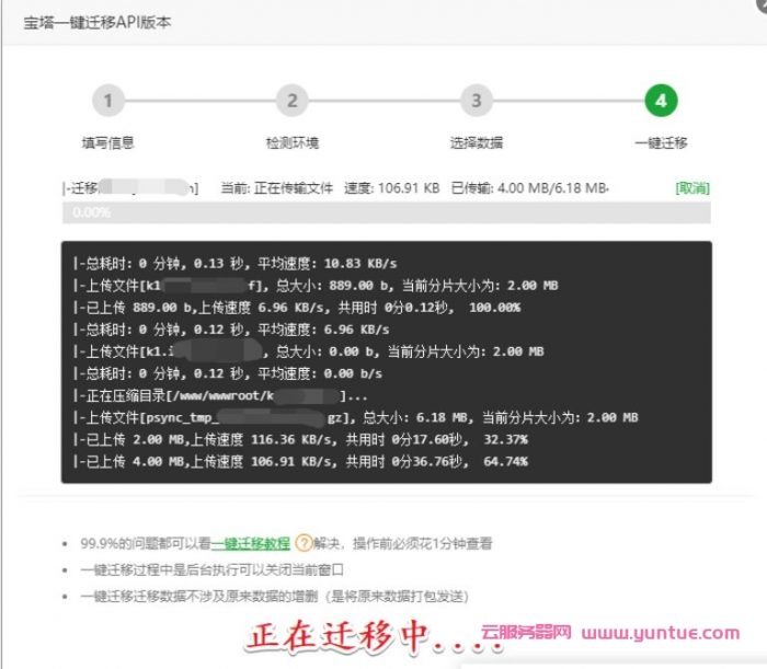 然后,在发送数据服务器上安装一键迁移工具,填写接收数据服务器信息,包括秘钥,就可以开始自动迁移了。
