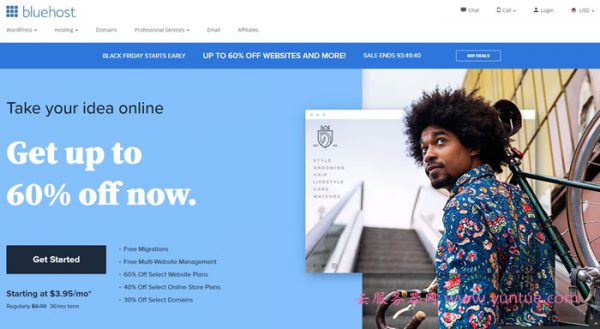 bluehost黑五优惠已经开始了,跟去年一样,也是虚拟主机优惠60%,即全场4折,优惠后的价格是月付3.95美元,bluehost还是WordPress官方推荐的“御用主机”!